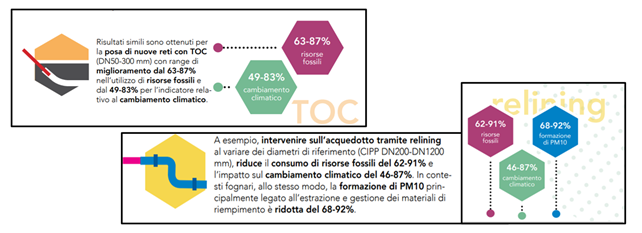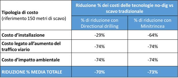 ![]() | Non a caso, il Regolamento di attuazione del Codice dei Contratti Pubblici In Italia, le classifica come “tecnologie a basso impatto ambientale”, evidenziandone la caratteristica peculiare, dimostrata anche da studi autorevoli che mostrano come il loro impiego riduca drasticamente i costi sociali e ambientali (-80% fonte TILab su modello di impatto ambientale elaborato dalla Federazione delle Industrie Svedesi), l’infortunistica sui cantieri (-67% fonte INAIL) e i consumi energetici (-56% fonte La Sapienza di Roma). Recenti nuovi studi condotti dall’Associazione nell’ambito del Sistema Idrico Integrato hanno permesso di affinare queste valutazioni, confermando comunque i valori percentuali di abbattimento degli impatti socio-ambientali. |
